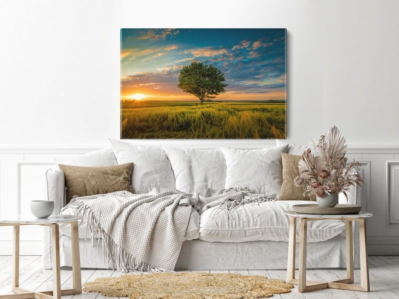 هوم جاليري زاوية واسعة لقطة شجرة واحدة تنمو السماء الملبدة بالغيوم أثناء غروب الشمس محاطة بالعشب تابلوه كانفاس مطبوع