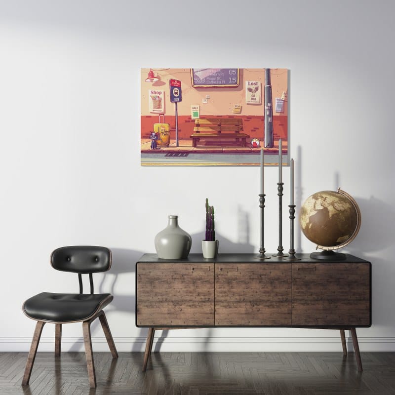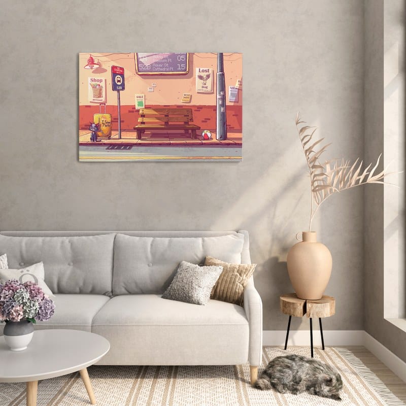 نطاق السعر: من EGP320.00 خلال EGP955.00     لوحة فنية مطبوعة على قماش لتوضيح محطة الحافلات مع قطة حزينة على خلفية متجهةنطاق السعر: من EGP320.00 خلال EGP955.00