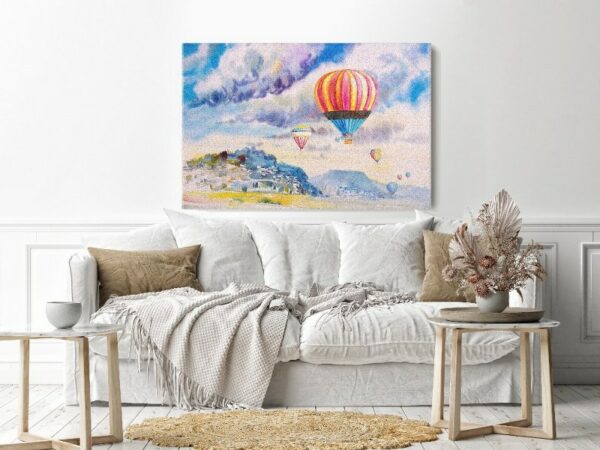 لوحة جدارية من القماش ، صورة مجردة مؤطرة لمنطاد الهواء الساخن في قرية جبلية وسحابة السماء الزرقاء