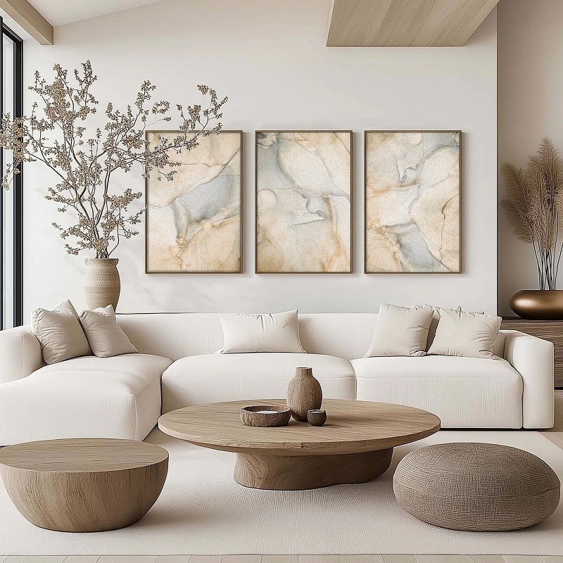 مجموعة من 3 لوحات جدارية بإطار من الرخام الأبيض والذهبي مع شريط ذهبي
