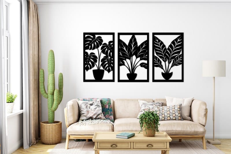 مجموعة من 3 لوحات جدارية خشبية على شكل نباتات منزلية في أصص، 145×80 سم
