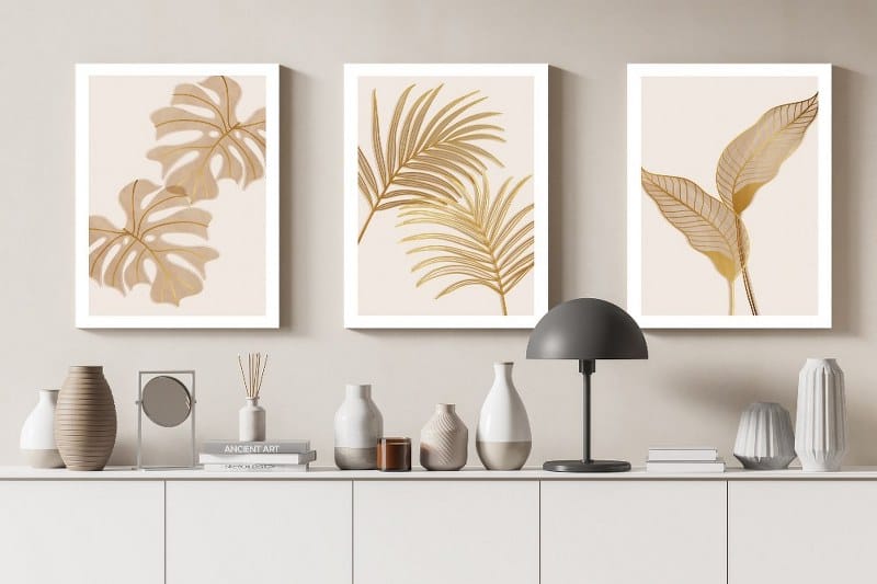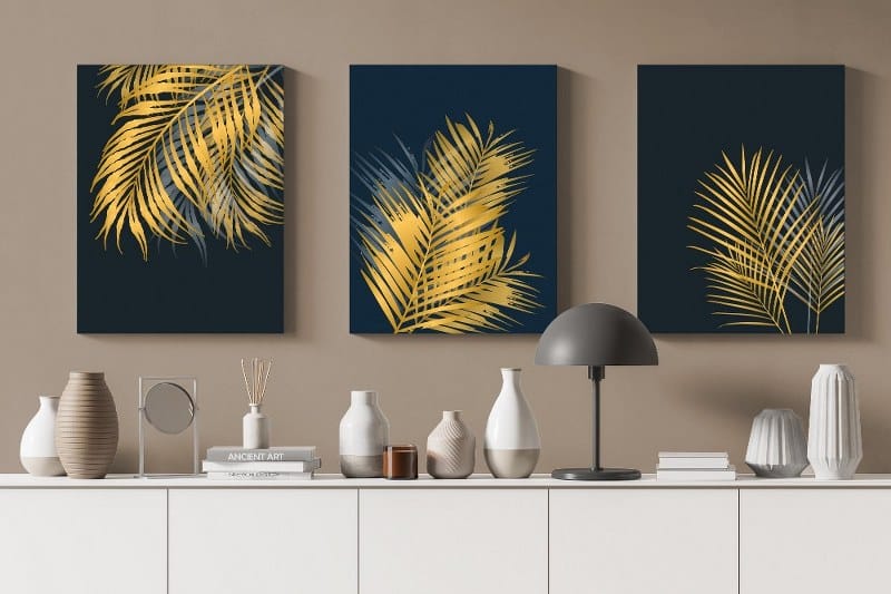Canvas Wall Art, Abstract Framed Portrait of Golden palm and tropical leaves