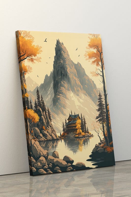Painting cabin canvas by lake with mountain background Printed wall art