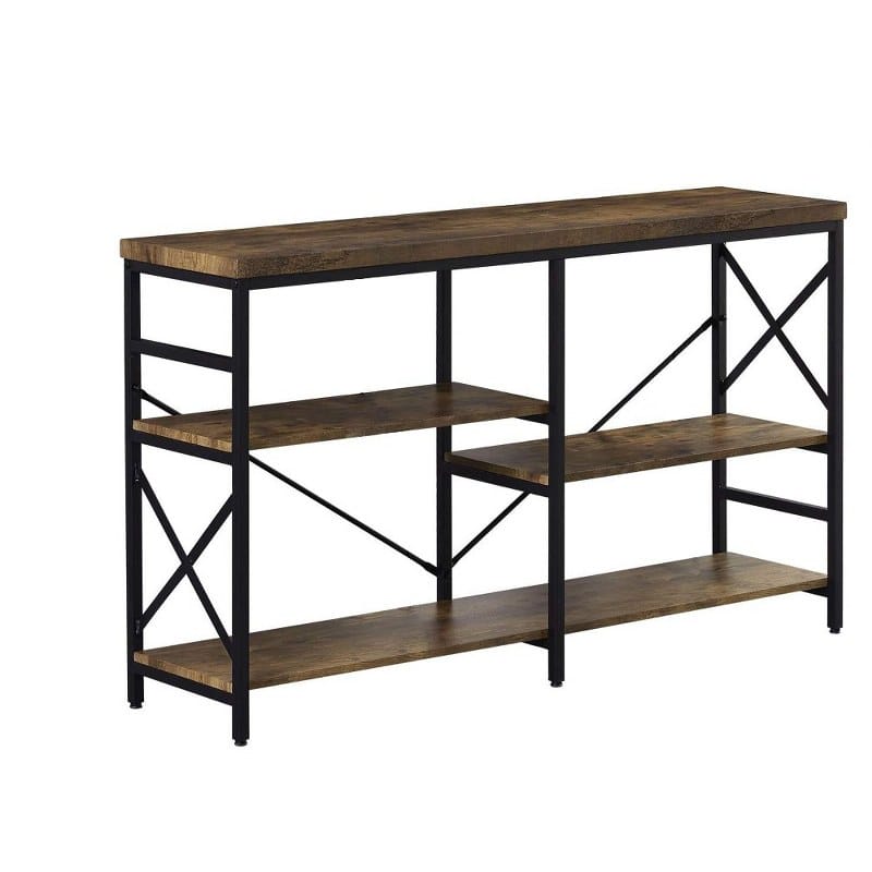 This industrial console table combines the warmth of vintage wood tones with the clean lines of black frosted steel; exuding elegance and rusticity; it can be perfectly matched with rustic; industrial or modern decor.