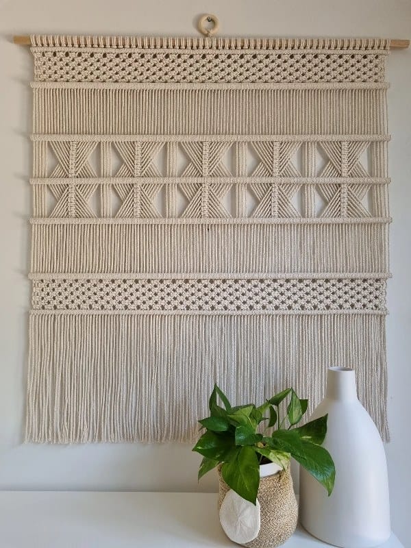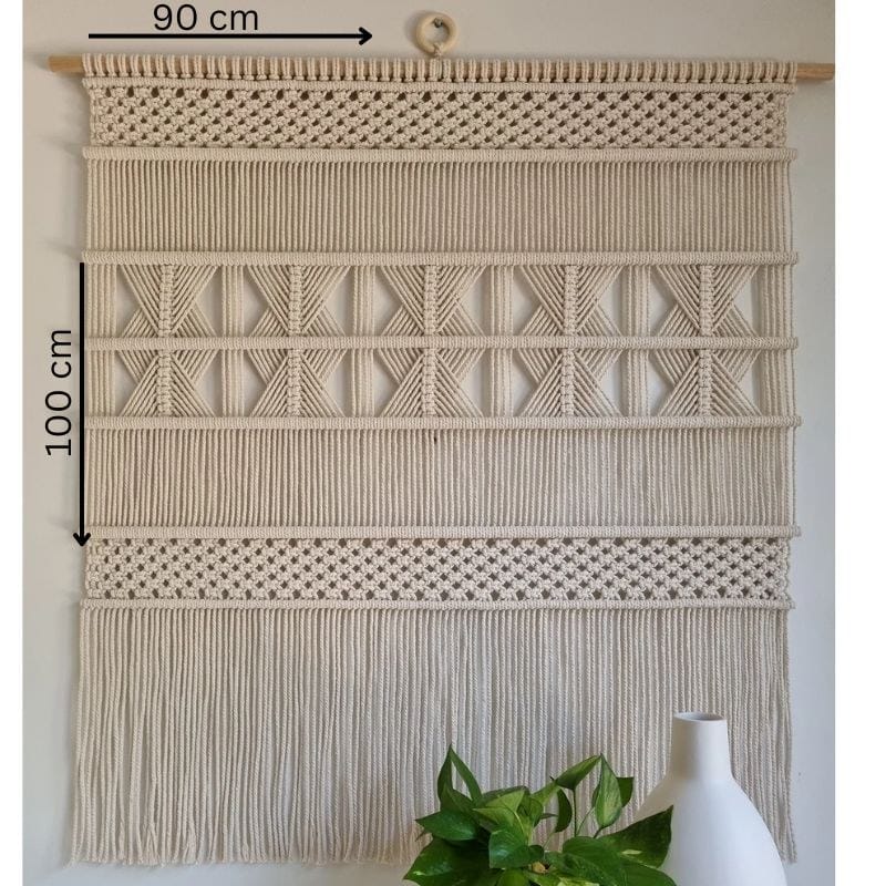 HIGH QUALITY MACRAME DESIGN Unique boho room decor, this carefully knitted macrame hanging on the wall with beautiful geometric weave pattern is made of natural rope knotted on the wooden dowel and has fringe accents.