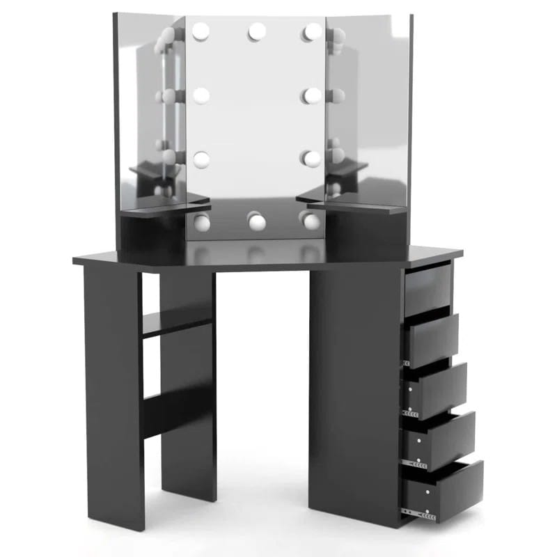 This corner vanity is simple yet elegant, and it doesn’t look out of place with any style of furniture. The three-fold mirror on the desktop features 10 LED bulbs that can be switched between natural, warm, and cool light. The mirrors on the side feature two shelves for skin care products, cosmetics, and jewelry. The table is made of solid and waterproof particle board and has two open shelves and five chests of drawers to meet your storage needs. With such thoughtful design details, you and your family or friends will love this piece of furniture.