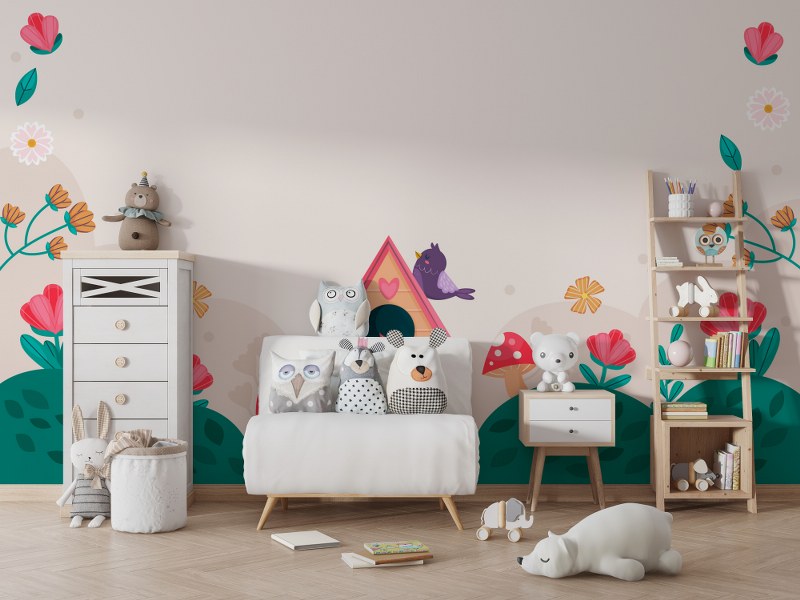 Painted Flowers And Green Leaves Fabric Wallpaper Covers an area ​​up to 4.2mX3m with adhesive  and smoothing tool