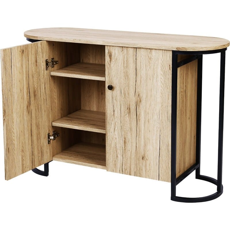 | Inspired by industrial style . The wood effect cabinet opens to reveal two internal shelves and ample space for storing all your miscellaneous items. The ideal unit for your living room or hallway; this sideboard is also part of a matching furniture collection with coordinating shelving units and TV stand available. |